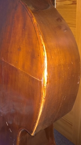 Der Bass war das tägliche Instrument zum üben. Soweit ich das beurteilen kann (bin kein Profi) ist das Instrument Vollholz. Einen Zettel mit dem Namen des Bassbauers konnte ich leider nicht sehen.