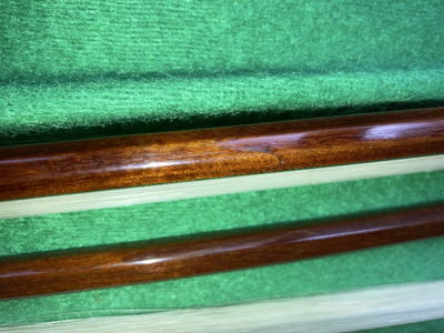 Der andere von zwei alten originalen Kurt Dölling Kontrabassbögen in gutem Zustand. Sehr klarer und obertonreicher Klang mit unmittelbarer Ansprache. Es gibt einen alten Haarriss in der Stange, der keine Beeinträchtigung darstellt. Auch der Frosch hat einen feinen Riss siehe Fotos.