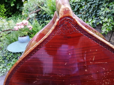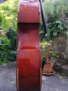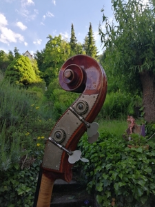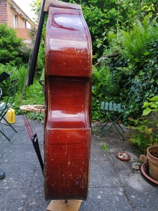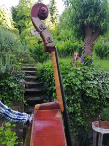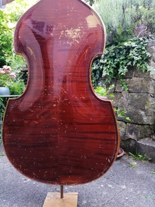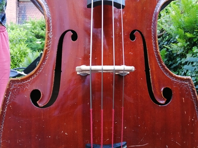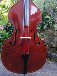 Kontrabass mit einigen Lackschäden,104cm schwingende Saitenlänge. Wen die optischen Mängel nicht stören, hat die Möglichkeit, einen hervorragend klingenden Bass, zu einem fairen Preis zu erwerben, komfortabel eingerichtet, alle Risse geschlossen, wurde sehr lange in einem französischen Orchester professionell gespielt, Steg von Jean Bejuy, zur Zeit mit Solo Saiten, ausprobieren gerne nach Absprache