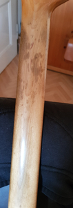 Eine von einem Vorbesitzer unvollständig auf die Oberfläche aufgebrachte Farbschicht mit hell-violettem "Metallic-Effekt" wurde 2019 von dem auf "Vintage"-Restaurationen spezialisierten Frankfurter Gitarrenbauer Matthias Schindehütte vollständig und fachgerecht entfernt und, wie er mir erklärte, wurde im selben Procedere an ein paar Stellen etwas ergänzt. Da der Original-Farbton professionell getroffen wurde, ist es praktisch unmöglich, noch irgendwelche Bearbeitungsspuren zu sehen - daher kann ich es nur mitteilen.