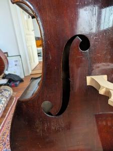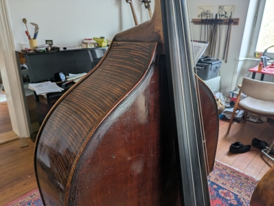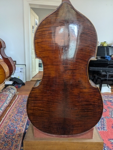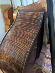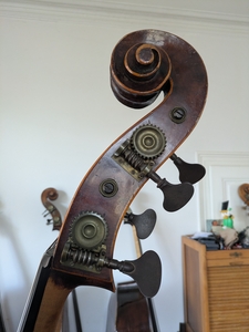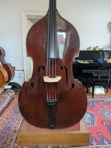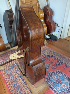 Im Auftrag eines verstorbenen Kollegen biete ich diesen sehr schönen französischen Kontrabass an, das Instrument hat eine schwingenden Saitenlänge von 109cm, wurde in der Vergangenheit fachmännisch repariert,es gibt Reparatureinträge aus Belgien, vermutlich wurde der Kontrabass im oberen Teil mal verkleinert,was der Bespielbarkeit sehr zuträglich ist und ausgesprochen professionell ausgeführt wurde.Der Ton ist sehr, sehr kräftig und durchsetzungsstark, davon kann man sich vor Ort gerne ein Bild machen, trotz der 109cm Saitenlänge bequem zu spielen, keinen Tausch!