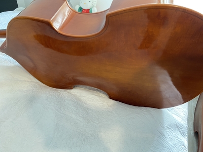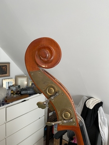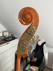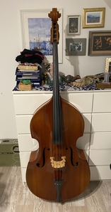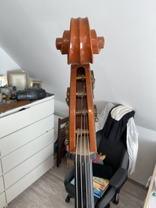 Ich verkaufe hiermit einen Kontrabass meines Schwiegervaters. Ursprünglich stammt dieser Bass aus Markneukirchen/DDR. Es ist ein 7/8-Kontrabass (Mensur 107cm, D-Mensur) mit massiver Fichtendecke, einem Sperrholzboden und mit breiten Zargen. Die Saiten sind die Nürnberger Künstlerseilsaiten aus Stahl mit elastischer Einlage und Chromstahlumspinnung (Solosaiten A-E-H-Fis, weich) aus der Werkstatt von Karl Weidler in Bubenreuth bei Erlangen. Dieser Bass ist wegen seines angenehmen und weichen, warmen Tones sehr gut für das Orchesterspiel aber auch für Anfänger geeignet.