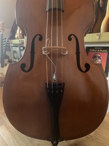 Professionell eingerichteter Kontrabass (Etikett von Johannes Riedle, Coburg Anno 1978) mit Fishman Full Circle Pickup und einem Steg - Beides von meinem geschätzten Geigenbauer aus Köln, Daniel Kress, ausgeführt. Die Saitenlage ist angenehm niedrig und es ist aktuell ein Jazz/Pop Setup mit Daddario The Jazzer Saiten.