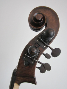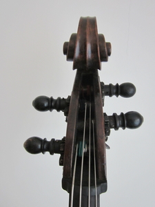 Gambenform. Größe zwischen 1/2 und 3/4. Nur etwas kleiner als 3/4. D - Mensur, 102 cm schwingende Saitenlänge. Sehr schöner, modulationsfähiger Ton eines alten Instrumentes und sehr tragfähig. Ohne jeden Druck leicht zu spielen. Für kleinere Menschen hervorragend geeignet. Im Moment mit Pirastro Passione Solo Saiten, ich kann aber gerne auch Orchestersaiten aufziehen. Bender Klangstachel. Verstellbarer Karbonstimmstock von DIASTRAD. Karbon Saitenhalter. Certification: Gutachten von Tobias Festl Preis VB.