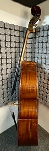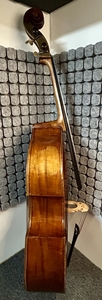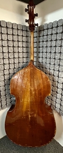 Aufgrund des Umstiegs auf 5-Saiter biete ich diesem wunderbaren Kontrabass mit viel Kraft und Tiefe an, der sich auch im Konzert bewährt hat. Das vollmassive Instrument mit gewölbtem Boden aus Deutscher Meisterwerkstatt wurde in der zweiten Hälfte des 19. Jahrhunderts gefertigt, extensiv gespielt und im vergangenen Herbst komplett revidiert (inkl. neues Ebenholzgriffbrett, Steg, Holzwirbel, etc.). Zum Schluss hat Martin Hillmann den Kontrabass bezüglich Bespielbarkeit und Klang optimal eingestellt. Aufgrund der Form der Schultern und des Keils unter dem Griffbrett sind die hohen Lagen trotz des grossen Resonanzkörpers gut zugänglich. Das Instrument kann gerne in der Region Zentralschweiz/Zürich angespielt werden.