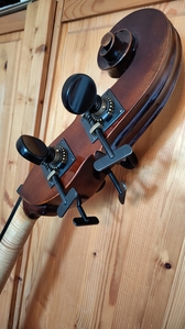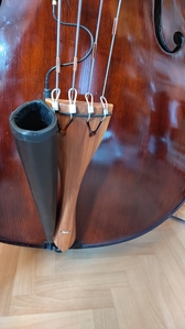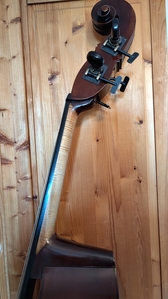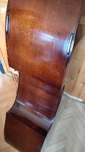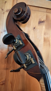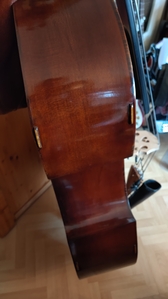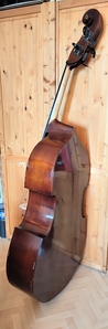 Durch die geniale Formgebung der Wiener Tradition ist auch dieser Kontrabaß länger (ich benutze bei 180 cm Körpergröße meist keinen erhöhten Stachel) und ist im Oberbug schlanker, als Bässe der konventionellen Gambenform.